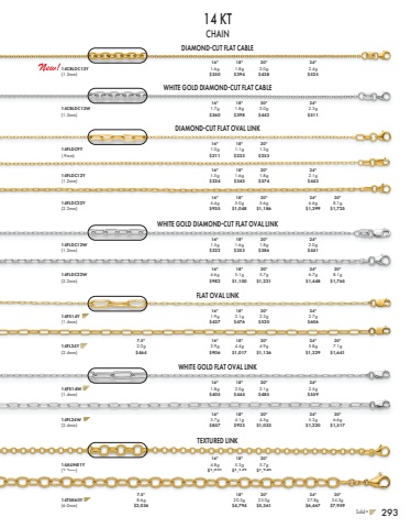 293 16\ 18\ 20\24\14CBLDC13W 1.7g 1.8g 2.0g 2.3g (1.3mm) $360 $398 $442 $511 WHITE GOLD DIAMOND%uf6baCUT FLAT CABLE 16\ 18\ 20\14FLDC9Y 1.0g 1.1g 1.2g (.9mm) $211 $233 $253 DIAMOND%uf6baCUT FLAT OVAL LINK(.9mm) $211 $233 $253 16\ 18\ 20\24\14FLDC12Y 1.5g 1.6g 1.8g 2.1g (1.2mm) .2mm) $324 $345 $374 $324 $345 $374 $443 16\ 18\ 20\24\ 30\14FLDC22Y 4.4g 5.0g 5.6g 6.6g 8.1g(2.2mm) $935 $1,048 $1,186 $1,399 $1,725 16\ 18\ 20\24\14FLDC12W 1.5g 1.6g 1.8g 2.0g (1.2mm) $322 $353 $386 $441 WHITE GOLD DIAMOND%uf6baCUT FLAT OVAL LINK(1.2mm) $322 $353 $386 $441 16\ 18\ 20\24\ 30\14FLDC22W 4.6g 5.1g 5.7g 6.7g 8.1g(2.2mm) $982 $1,100 $1,221 $1,448 $1,765FLAT OVAL LINK FLAT OVAL LINK 16\ 18\ 20\24\14FS14Y 1.9g 2.1g 2.3g 2.7g (1.4mm) (1.4mm) $437 $476 $520 $437 $476 $520 $606 7.5\16\ 18\ 20\24\ 30\14FL24Y 2.0g 3.9g 4.4g 4.9g 5.8g 7.1g(2.4mm) $464 $906 $1,017 $1,136 $1,329 $1,641WHITE GOLD FLAT OVAL LINK 16\ 18\ 20\24\14FS14W 1.8g 2.0g 2.1g 2.5g (1.4mm) ( ) $405 $444 $485 $559 16\ 18\ 20\24\ 30\14FL24W 3.7g 4.1g 4.5g 5.3g 6.6g(2.4mm) $847 $933 $1,033 $1,220 $1,517 16\ 18\ 20\24\14CBLDC13Y 1.6g 1.8g 2.0g 2.4g (1.3mm) $350 $394 $438 $525 DIAMOND%uf6baCUT FLAT CABLE 16\ 18\ 20\14AUNE1Y 4.8g 5.3g 5.7g (3.2mm) $1,031 $1,142 $1,240 TEXTURED LINK( ) $ , $ , $ , 7.5\18\ 20\24\ 30\14TSK60Y 8.6g 20.5g 23.0g 27.8g 34.3g(6.0mm) $2,036 $4,794 $5,361 $6,467 $7,95914 KTCHAINSolid =